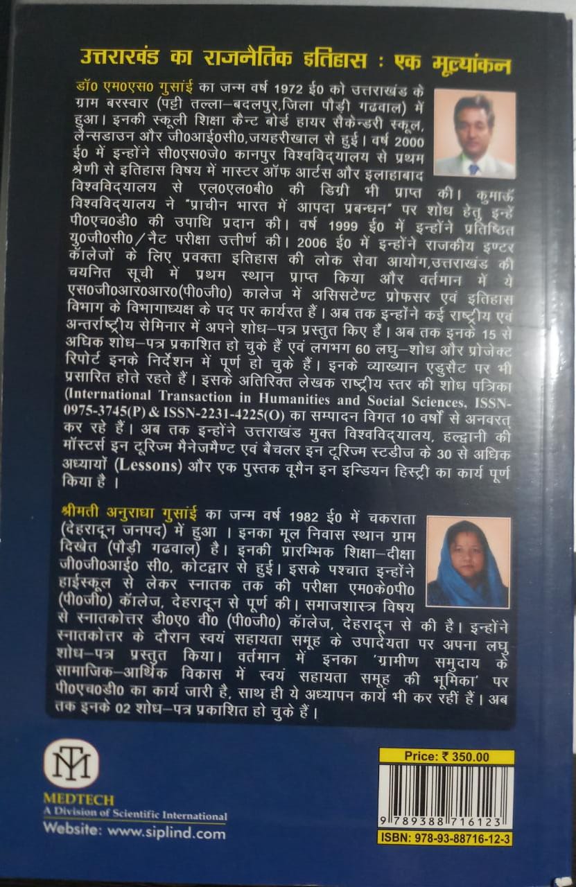 उत्तराखंड का राजनैतिक इतिहासः एक मूल्यांकन। यह डॉ. मेहरबान सिंह गुंसाई और अनुराधा गुंसाई की एक महत्वपूर्ण पुस्तक है। उत्तराखंड के सामाजिक-राजनीतिक इतिहास पर रुचि रखने वाले जिज्ञासुओं, शोधार्थियों और पाठकों के बीच यह पुस्तक लोकप्रिय है। यह पुस्तक को प्रतियोगी परीक्षाओं की तैयारी कर रहे छात्रों के लिए भी उपयोगी है। पुस्तक में पुस्तक में कुल 14 अध्याय हैं। जिनमें सम्पूर्ण उत्तराखंड के इतिहास को समेटने का प्रयास किया गया है।