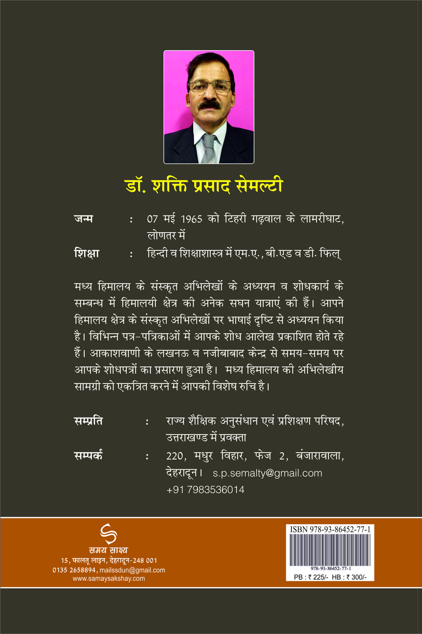 मध्य हिमालय के संस्कृत अभिलेखों में गढ़वाली भाषा का स्वरूप। डॉ. शक्ति प्रसाद सेमल्टी की यह पुस्तक उनका शोध प्रबंध है जो संस्कृत अभिलेखों में उपलब्ध गढ़वाली भाषा का विवेचन करता है। प्राप्त अभिलेखों में संस्कृत, गढ़वाली, हिन्दी के रूपों का तुलनात्मक अध्ययन किया गया है। पुस्तक में ध्वनी विज्ञान, रूप विज्ञान, वाक्य विज्ञान, अर्थ विज्ञान, शब्द विज्ञान के दृष्टिकोण से भाषाशास्त्रीय अध्ययन किया गया है। पुस्तक में विभिन्न लिपियों में प्राप्त संस्कृत अभिलेख जो जनपद पौड़ी,, रुद्रप्रयाग चमोली, देहरादून, उत्तरकाशी व टिहरी में प्राप्त हुए हैं, का विस्तृत अध्ययन किया गया है। इनमें पाण्डुकेश्वर, कालीमठ, गोपेश्वर, पलेठी, लाखामंडल, उत्तरकाशी, टिहरी, रुद्रप्रयाग व देवप्रयाग के प्रसिद्ध शिलालेख भी शामिल हैं। यह पुस्तक संस्कृत साहित्य के प्रेमियों व गढ़वाल इतिहास के अध्येताओं के लिए उपयोगी है।